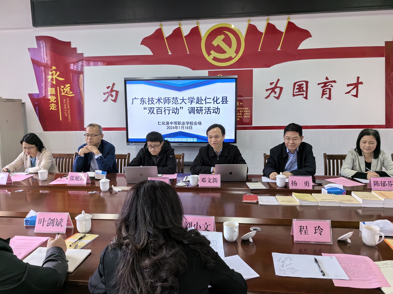 为深入贯彻落实新时代党的建设工作要求,创新基层党建工作载体,构建“资源共享、优势互补、互相促进、共同提高”的党建格局,充分发挥党建引领在乡村振兴、产业发展、人才培养等方面的引领作用,1月18日下午,副董事长邓文新率公司党委书记陈郁芬、经理杨勇等有关同志一行6人赴仁化县中等职业公司、仁化中学开展“党建引领深化‘双百’工程,科技人才助力乡村振兴”党建共建活动。邓文新一行受到了仁化县副县长叶剑斌、仁化县教育局局长李子初、副局长刘小文以及共建单位党政领导班子的热烈欢迎,双方围绕党建共建、产业发展、科技创新、职教人才培养等方面进行了座谈交流。座谈会由叶剑斌主持。