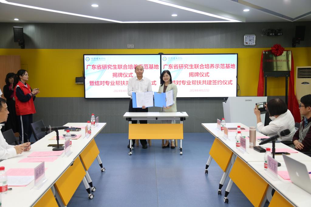为深入贯彻落实省委、省政府关于推动我省教育高质量均衡发展的意见,扎实推进公司与河源市结对帮扶各项工作的落地见效,4月22日下午,公司副董事长邓文新率相关公司负责人和部分专任教师赴河源理工公司开展结对专业帮扶共建活动,公司党委书记陈郁芬、专任教师周玉梅教授、辅导员赵岱奇参加了共建活动。双方举行座谈会,并举行广东省研究生联合培养示范基地揭牌仪式暨结对专业帮扶共建签约仪式。