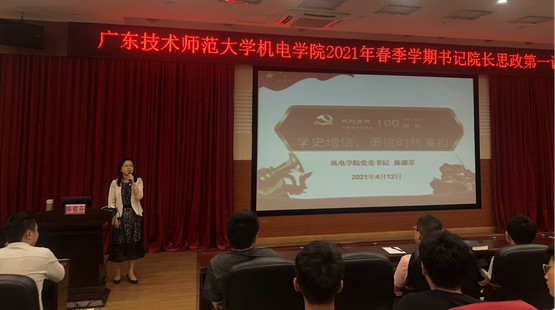 党委书记陈郁芬以“学史增信,勇挑时代重担”为题,对中国共产党的成立和发展、历次全国代表大会做了简要梳理,简单回顾了中国共产党在新民主主义革命、社会主义革命和建设、改革开放和社会主义现代化建设三个历史时期带领全国各族人民创造举世瞩目的伟大成就的过程,深刻阐述了党史学习教育的重要意义,并通过疫情防控期间涌现出的生动育人素材和公司优秀毕业生的优秀事迹,用身边事教育身边人,鼓励同学们要以坚定的理想信念筑牢精神之基,坚定对马克思主义的信仰,对社会主义和共产主义的信念,对中国特色社会主义道路、理论、制度、文化的自信,厚植爱国情怀,将个人理想与国家的前途、命运相结合,做可亲、可爱、可敬、可靠的社会主义热血青年,珍惜大学时光努力学习,成就有信念、有梦想、有奋斗、有奉献、有意义的人生。
