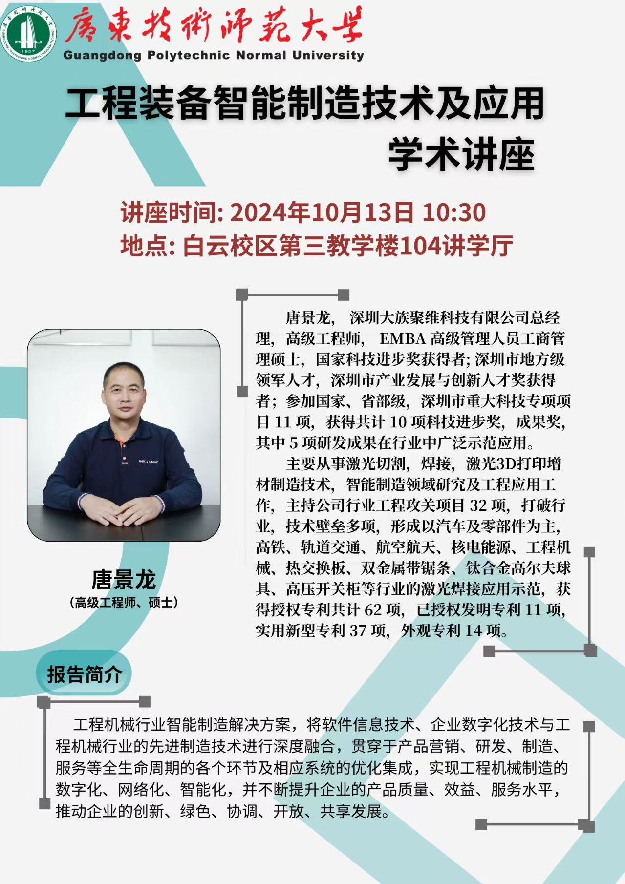 二、讲座嘉宾:唐景龙,深圳大族聚维科技有限公司总经理,高级工程师, EMBA 高级管理人员工商管理硕士,国家科技进步奖获得者; 深圳市地方级领军人才,深圳市产业发展与创新人才奖获得者
