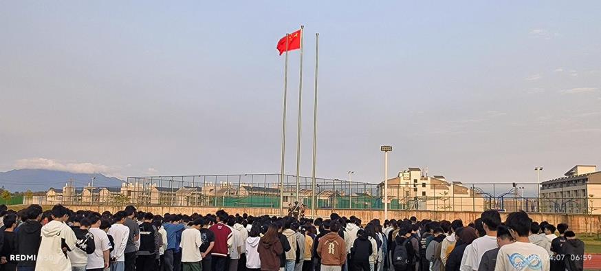 “升旗仪式现在开始,升国旗,奏国歌。”早上六点五十分,随着雄壮的《义勇军进行曲》奏响,五星红旗冉冉升起,迎风飘扬在校园上空。全体师生精神饱满、肃然而立,一同向国旗行注目礼,共同祝愿伟大祖国繁荣昌盛。